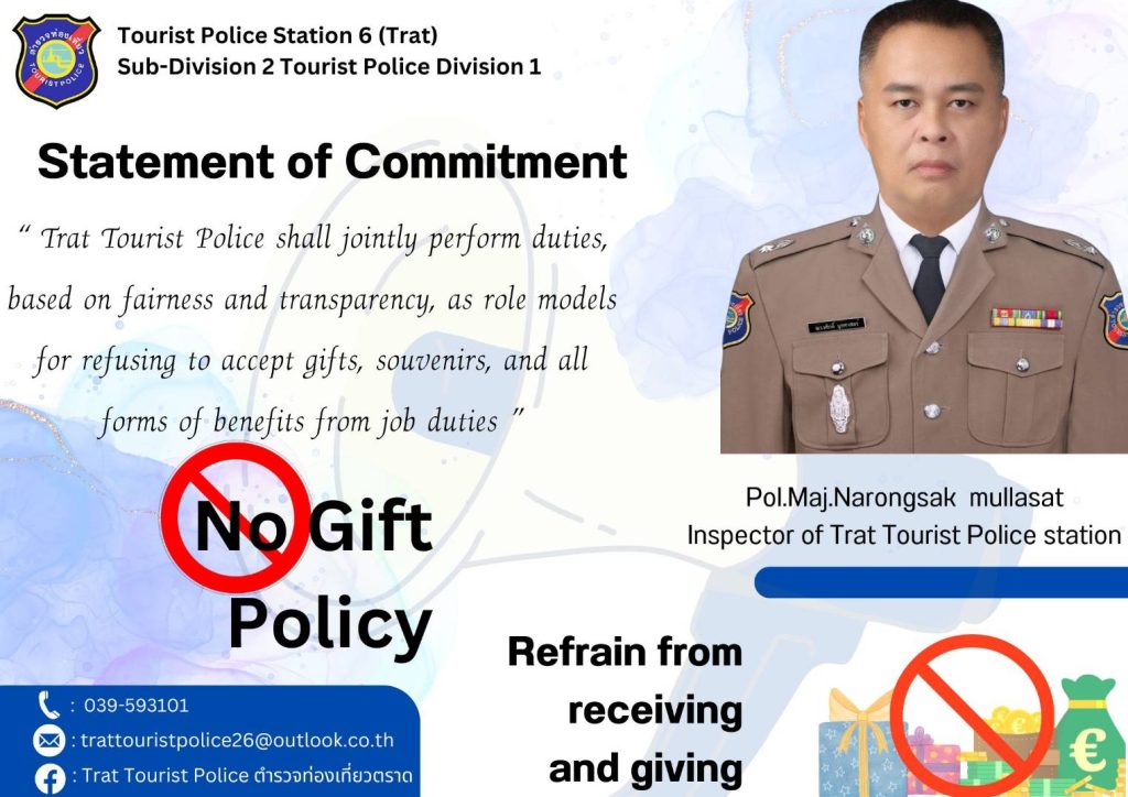 สถานีตำรวจท่องเที่ยว 6 กองกำกับการ 2 กองบังคับการตำรวจท่องเที่ยว 1 (จังหวัดตราด) 368 หมู่ 7 ต.หนองเสม็ด อ.เมือง จ.ตราด 23000