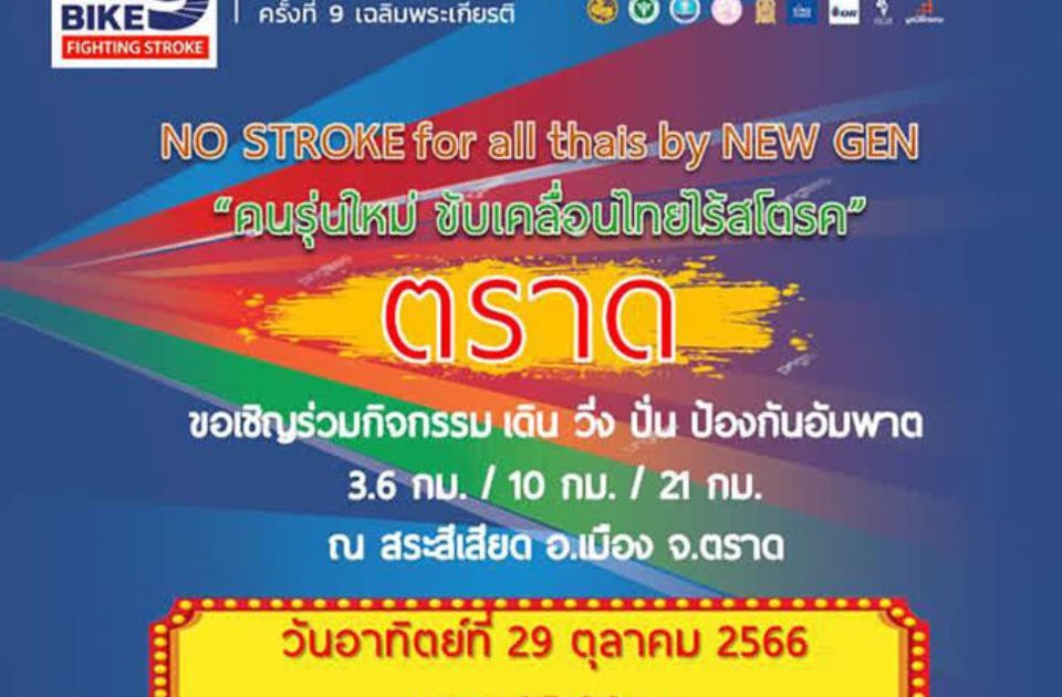 นายสุรชัย เจียมกูล นักวิชาการสาธารณสุขเชี่ยวชาญ รักษาราชการแทนนายแพทย์สาธารณสุขจังหวัดตราด เปิดเผยว่า ศูนย์โรคหลอดเลือดสมองศิริราช คณะแพทยศาสตร์ศิริราชพยาบาล มหาวิทยาลัยมหิดล ร่วมกับกระทรวงมหาดไทย กระทรวงสาธารณสุข กระทรวงศึกษาธิการ และกระทรวงการท่องเที่ยวและกีฬา กำหนดจัดโครงการ “แสงนำใจไทยทั้งชาติ เดิน วิ่ง ปั่น ป้องกันอัมพาต เฉลิมพระเกียรติ” ซึ่งจัดติดต่อเป็นประจำทุกปี และในปี 2566 จัดเป็นครั้งที่ 9 ในหัวข้อ “คนรุ่นใหม่ ขับเคลื่อนไทยไร้สโตรค (No STROKE for all Thais by NEW GEN)” ระหว่างวันที่ 24 – 29 ตุลาคม 2566 โดยมีวัตถุประสงค์เพื่อเฉลิมพระเกียรติพระบาทสมเด็จพระเจ้าอยู่หัว และสมเด็จพระนางเจ้าฯ พระบรมราชินี ที่ทรงเป็นดั่งแสงนำใจและทรงเป็นแบบอย่างในการรักษาสุขภาพและการออกกำลังกายแก่ประชาชนชาวไทย และเพื่อให้ประชาชนชาวไทยตระหนักถึงความสำคัญของการป้องกันโรคหลอดเลือดสมอง ด้วยการส่งเสริมความรู้และออกกำลังกายป้องกันโรคหลอดเลือดสมอง